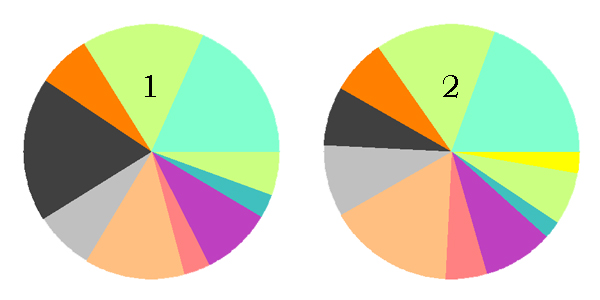You can see that no two of these siblings have exactly the same ethnic profile. One and three have that yellow area. Three and four have a light blue area. Number one has a tiny slice of dark green, which four has in a larger proportion.